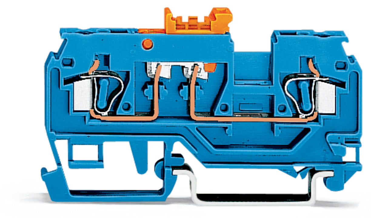 2-conductor disconnect/test terminal block; with pivoting knife disconnect; with test port; orange disconnect link; suitable for Ex i applications; for DIN-rail 35 x 15 and 35 x 7.5; 2.5 mm²; CAGE CLAMP®; 2,50 mm²; blue