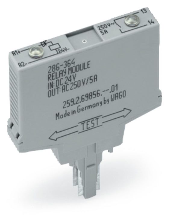 Relay module; Nominal input voltage: 24 VDC; 1 make contact; Limiting continuous current: 5 A; Red status indicator; Module width: 10 mm; gray